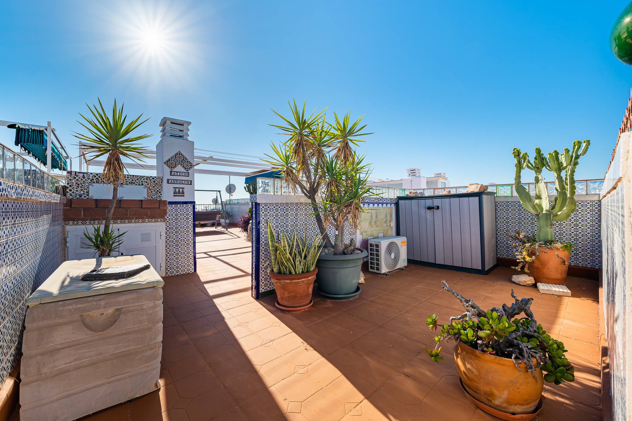 La joya del alojamiento es su azotea privada: una terraza elevada con vistas despejadas al horizonte y al mar. Disfrútala con una ducha exterior al sol, zona chill out, futbolín, barbacoa, comedor exterior bajo pérgola (en instalación) y tumbonas que invitan al descanso absoluto.