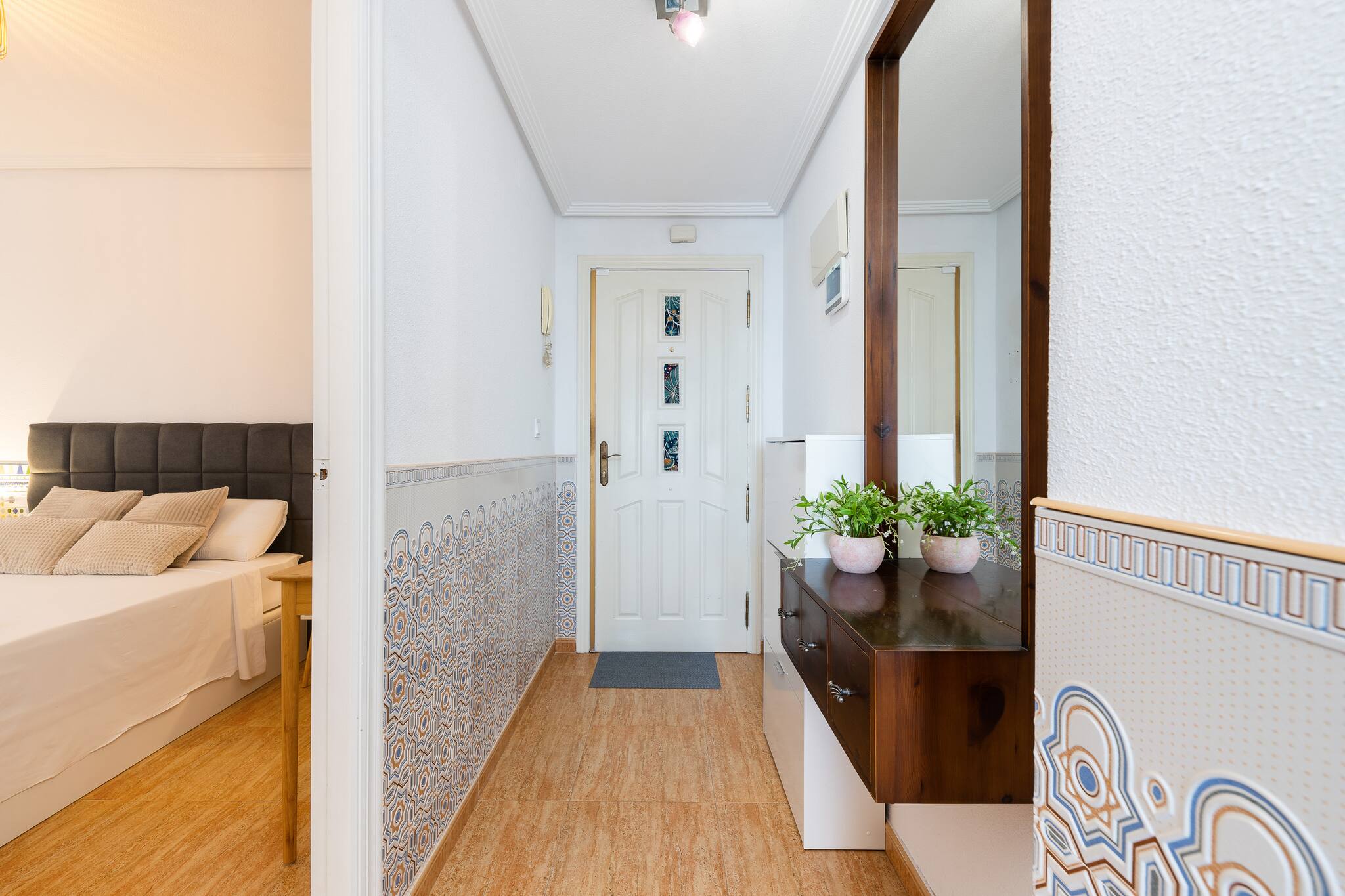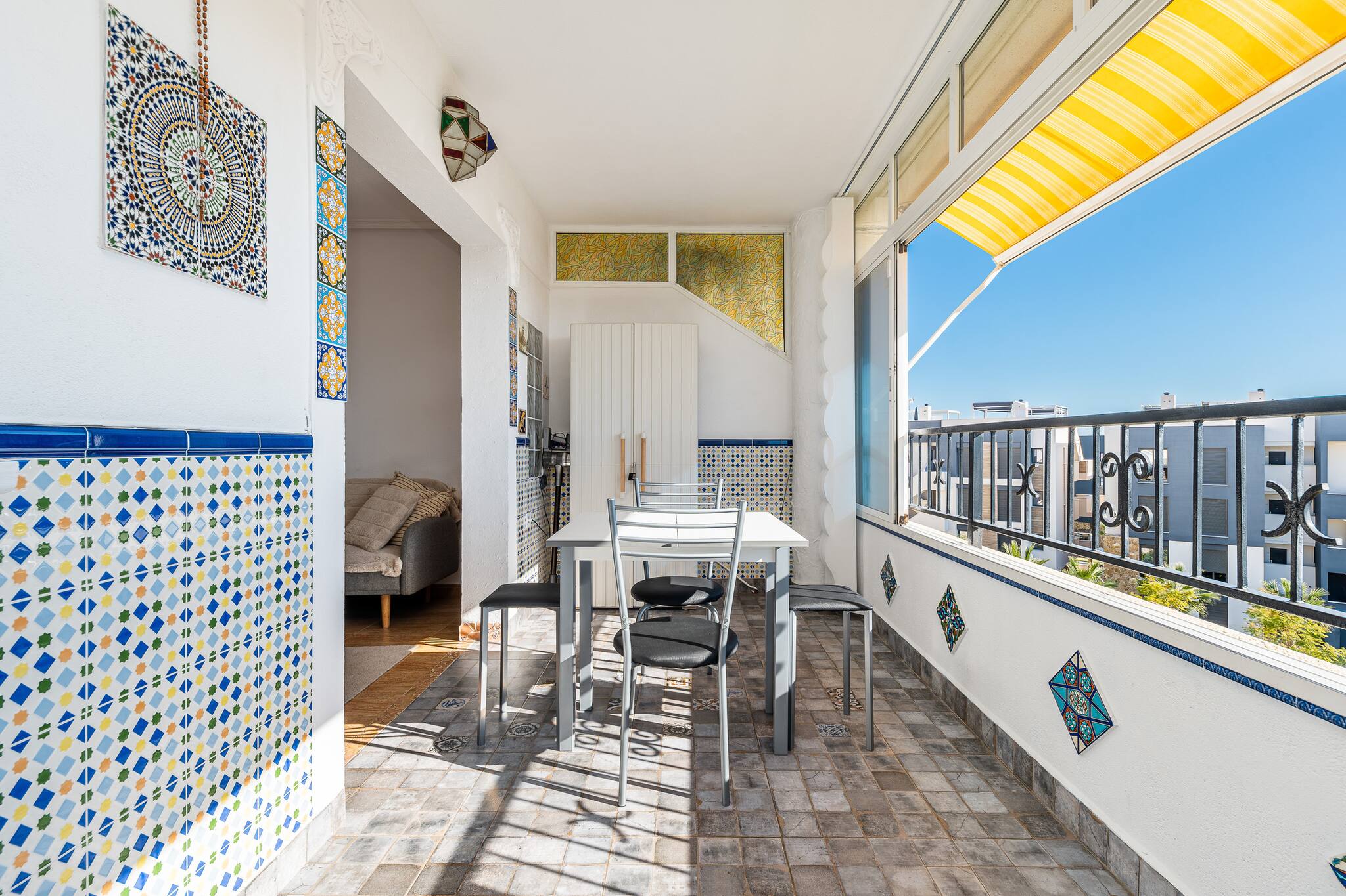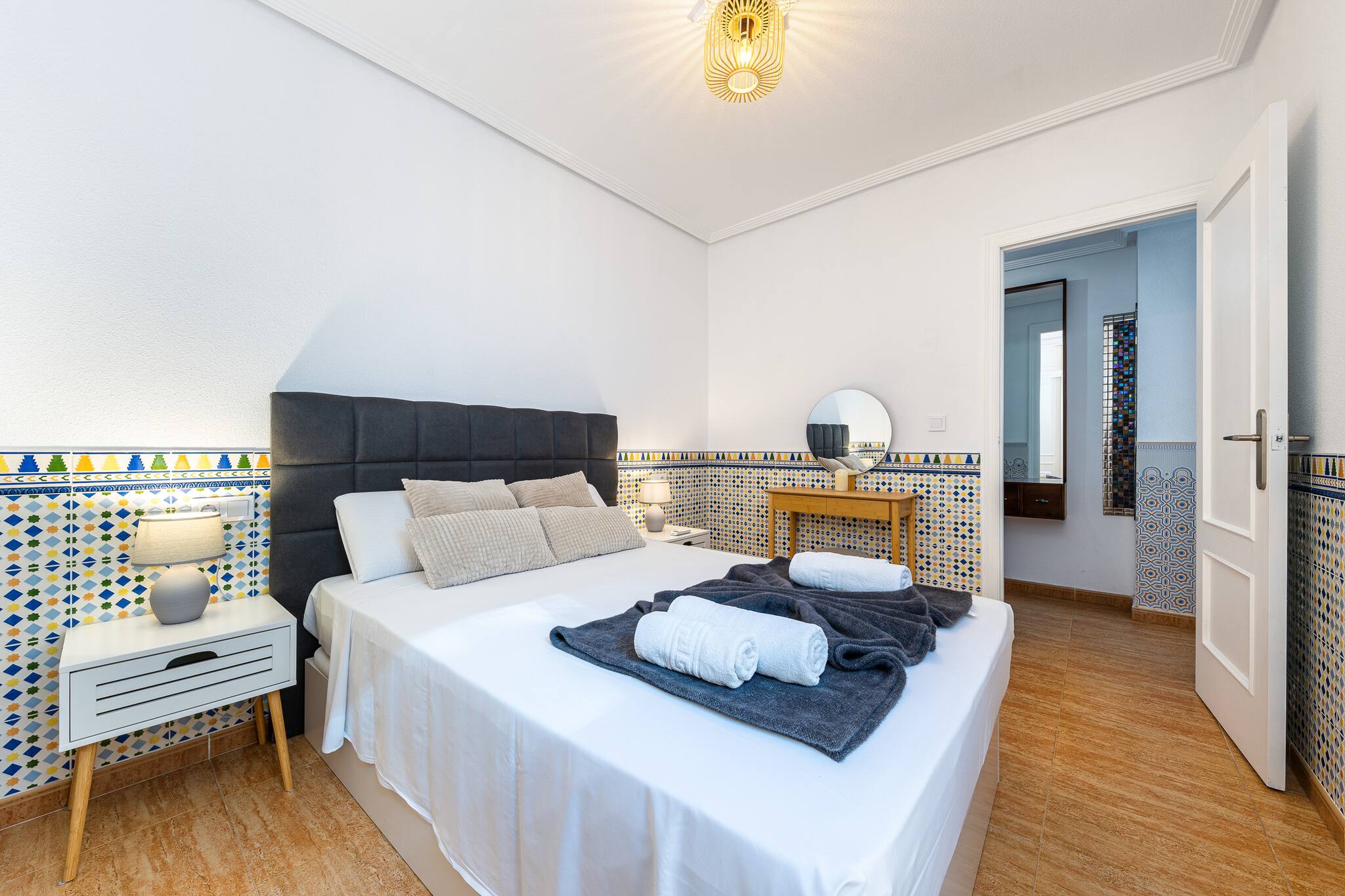 En sus tres dormitorios, cada uno con personalidad propia, descubrirás papeles pintados con carácter, tonos pastel envolventes, techos con molduras y televisión en cada habitación. El amplio salón y la terraza principal —con sus sillones colgantes tipo huevo— son el rincón perfecto para compartir una charla o una copa al atardecer.
