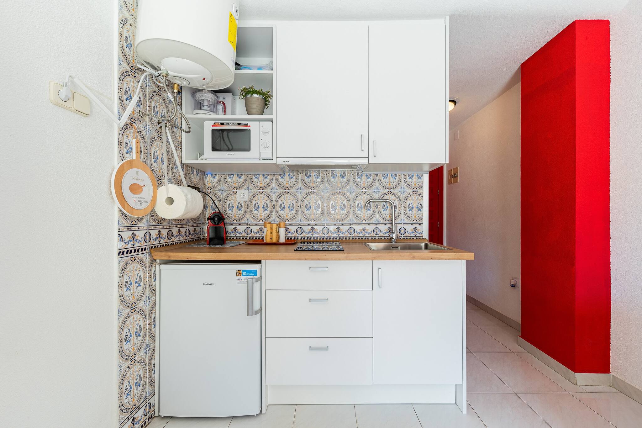 Desde el momento en que entras, el apartamento transmite frescura, luz natural y una decoración cuidada al detalle. La zona de estar ofrece un espacio relajante con un sofá cómodo, televisión de pantalla plana y detalles decorativos que aportan calidez y estilo. El gran mural con hojas tropicales realza el carácter contemporáneo y distintivo del salón. La cocina americana es prácticamente nueva, equipada con electrodomésticos de alta gama: vitrocerámica, horno, microondas, frigorífico combi, cafetera y todo lo necesario para preparar tus platos favoritos.