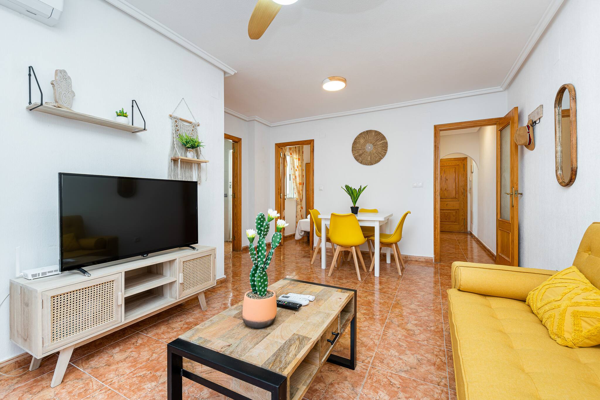 El interior combina un encanto moderno con elementos naturales, creando un ambiente cálido y acogedor. El salón, con su sofá mostaza y un vibrante comedor, se abre a un balcón privado, perfecto para disfrutar de la brisa mediterránea .