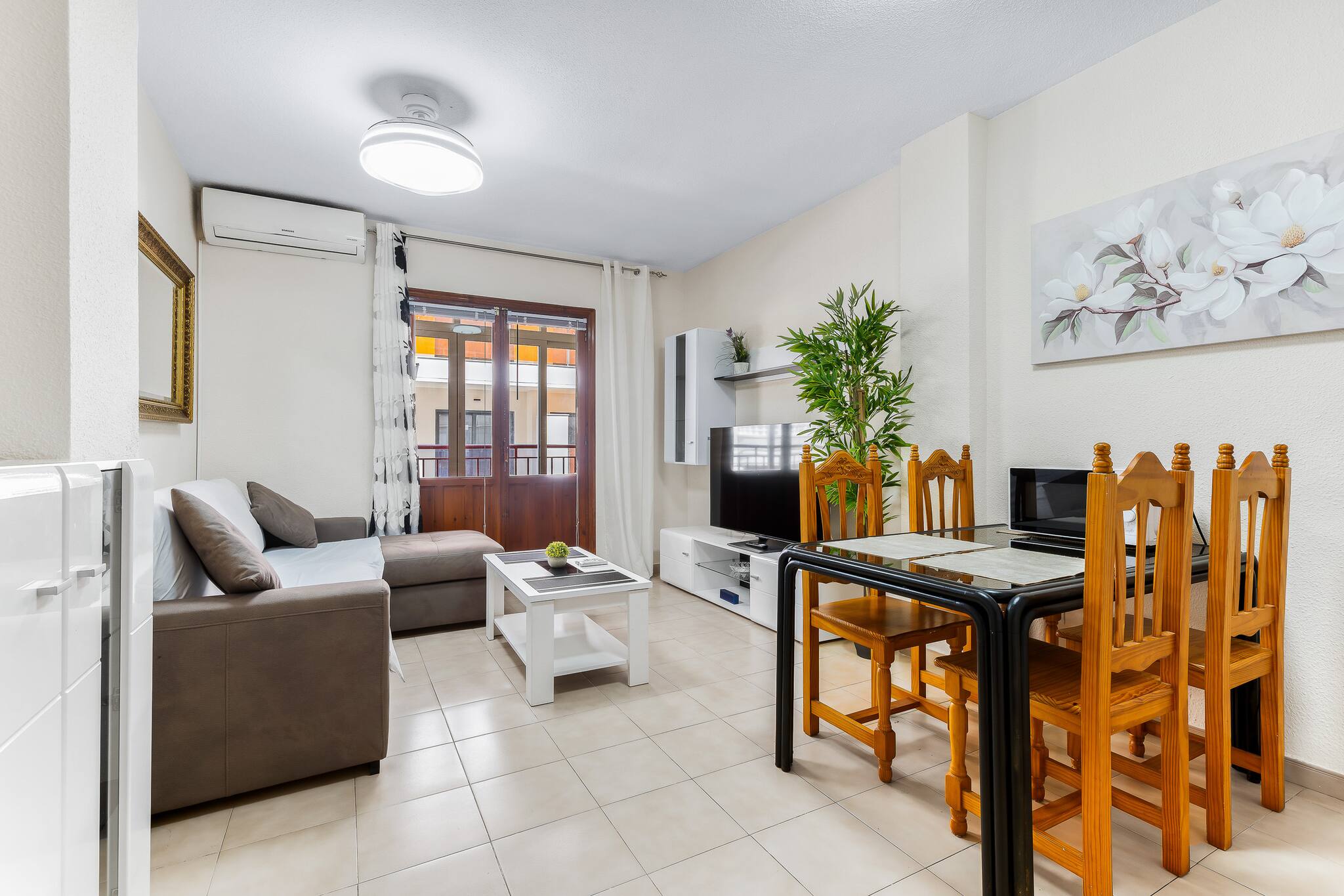 La cocina está equipada con los principales electrodomésticos (cafetera, microondas, horno, nevera y vitrocerámica), y el salón dispone de una Smart TV.