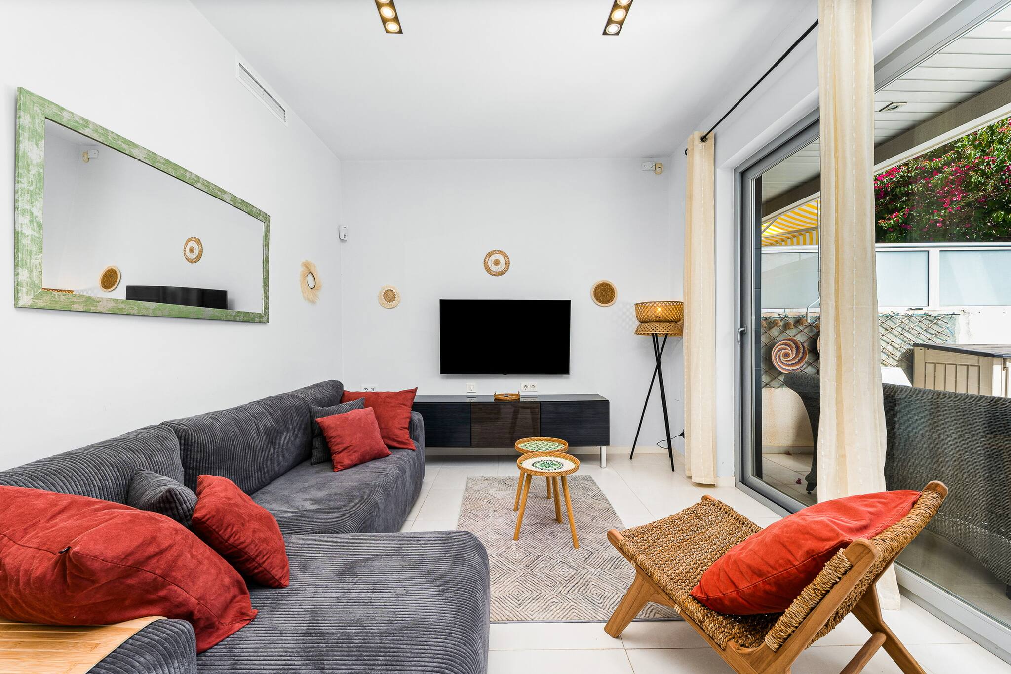 La cocina está equipada con los principales electrodomésticos (cafetera, microondas, horno, nevera y vitrocerámica), y el salón dispone de una Smart TV.