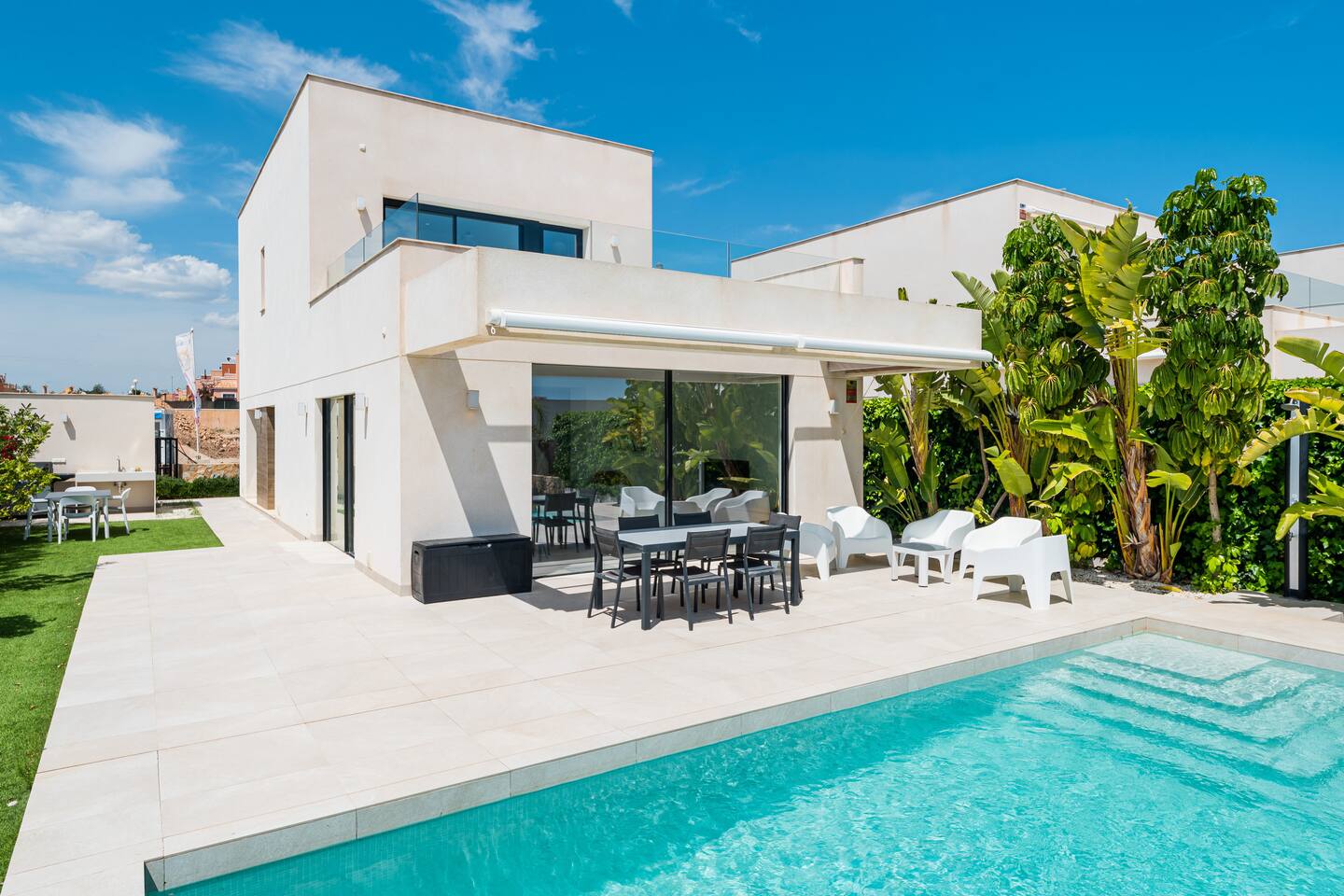 Moderna y espaciosa villa de nueva construcción en Los Montesinos, ideal para vacaciones inolvidables. Con 192 m², 4 dormitorios y 3 baños, ofrece total comodidad para familias o grupos. Su diseño independiente garantiza privacidad y tranquilidad, mientras que su piscina privada y amplias estancias crean el ambiente perfecto para relajarse. Totalmente equipada para una estancia sin preocupaciones, ubicada en el exclusivo Residencial Señorío Herrada Fase 4. ¡Tu refugio perfecto al sol!