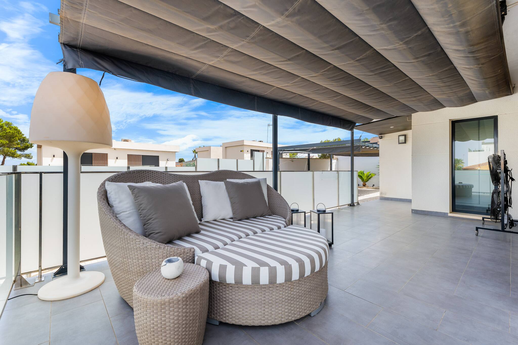 Disfruta de esta espectacular villa moderna en Los Balcones con piscina infinity privada, jardín con césped artificial, tumbonas y zonas chill-out. Interior luminoso y elegante, ideal para relajarse en familia o con amigos. Ubicada en una zona residencial tranquila, a solo minutos de las playas, restaurantes y supermercados de Torrevieja. ¡Perfecta para unas vacaciones inolvidables en la Costa Blanca!