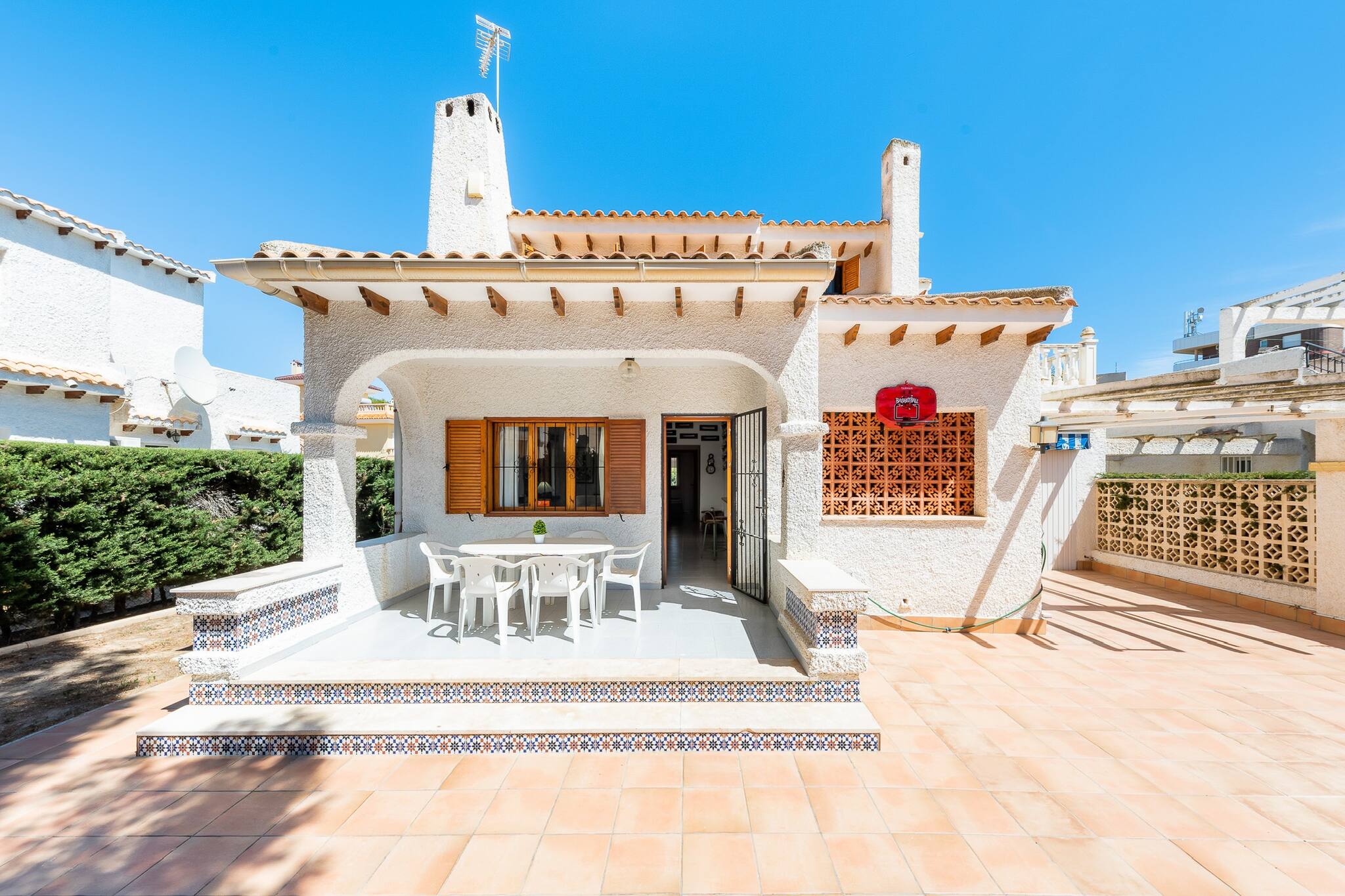 Das Ferienhaus in Orihuela Costa verfügt über 4 Schlafzimmer und hat eine Kapazität für 8 Person(en). Die gemütlich und sonnige Unterkunft verfügt über 150 m². Die Unterkunft befindet sich 1 km vom Golfplatz "Villamartín Golf" entfernt, 1 km von der Stadt "Villamartín Plaza", 2 km vom Supermarkt "Mercadona", 2 km vom Supermarkt "Consum", 2 km von der Stadt "Centro Comercial La Zenia Boulevard", 3 km vom Kiesstrand "Cala Mosca", 3 km vom Golfplatz "Las Ramblas Golf", 3 km vom zum Sandstrand "Playa Flamenca", 4 km vom zum Sandstrand "Playa de La Zenia", 4 km vom zum Sandstrand "Cala Capitán", 6 km von der Stadt "Las Colinas Golf", in einem Wohngebiet und in einer Ferienanlage. Die Unterkunft verfügt über einen Garten, Gartenmöbel, eine Waschmaschine, einen Grillplatz, einen Kamin, ein Internetanschluss (WLAN), ein Föhn, eine Wärmepumpe, eine Klimaanlage, einen Gemeinschaftspool, 1 Fernseher, Satelliten-TV (in den folgenden Sprache(n): Englisch). Die Separate Küche mit Induktions-Kochfeld ist ausgestattet in einen Kühlschrank, eine Mikrowelle, ein Backofen, Gefrierschrank, eine Spülmaschine, Geschirr/Besteck, Kochutensilien, eine Kaffeemaschine, einen Toaster, einen Wasserkocher und Herdplatte.