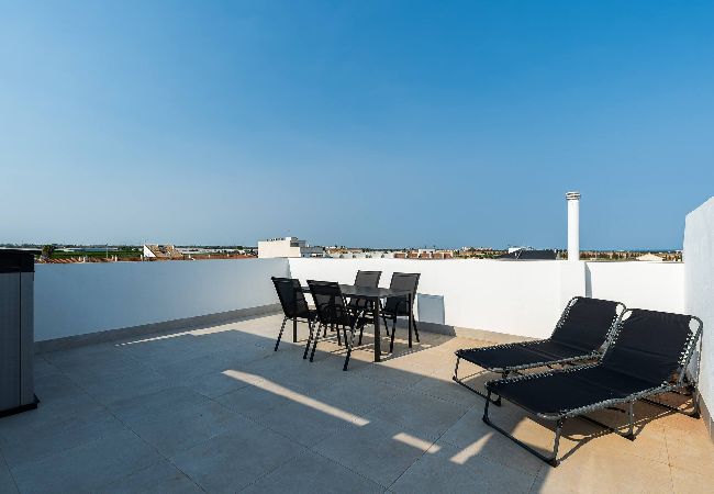 Das Ferienhaus in Pilar de la Horadada verfügt über 2 Schlafzimmer und hat eine Kapazität für 4 Person(en). Die gemütlich und sonnige Unterkunft verfügt über 90 m². Die Unterkunft befindet sich 200 m von der Stadt "Centro" entfernt, 300 m vom Supermarkt "Consum", 800 m vom Supermarkt "Mercadona", 1 km vom Supermarkt "Lidl", 3 km vom zum Sandstrand "Playa del Mojón", 4 km vom zum Sandstrand "Playa de las Higuericas", 4 km vom zum Sandstrand "Playa de Mil Palmeras", 5 km vom Golfplatz "Lo Romero Golf", 10 km vom Golfplatz "Villamartín Golf", in einem Wohngebiet und im Zentrum.Die Unterkunft verfügt über eine Waschmaschine, ein Internetanschluss (WLAN), eine Wärmepumpe, eine Klimaanlage, 1 Fernseher.Die Offene Küche mit Induktions-Kochfeld ist ausgestattet in einen Kühlschrank, eine Mikrowelle, ein Backofen, Gefrierschrank, eine Spülmaschine, Geschirr/Besteck, Kochutensilien, eine Kaffeemaschine und einen Wasserkocher.
