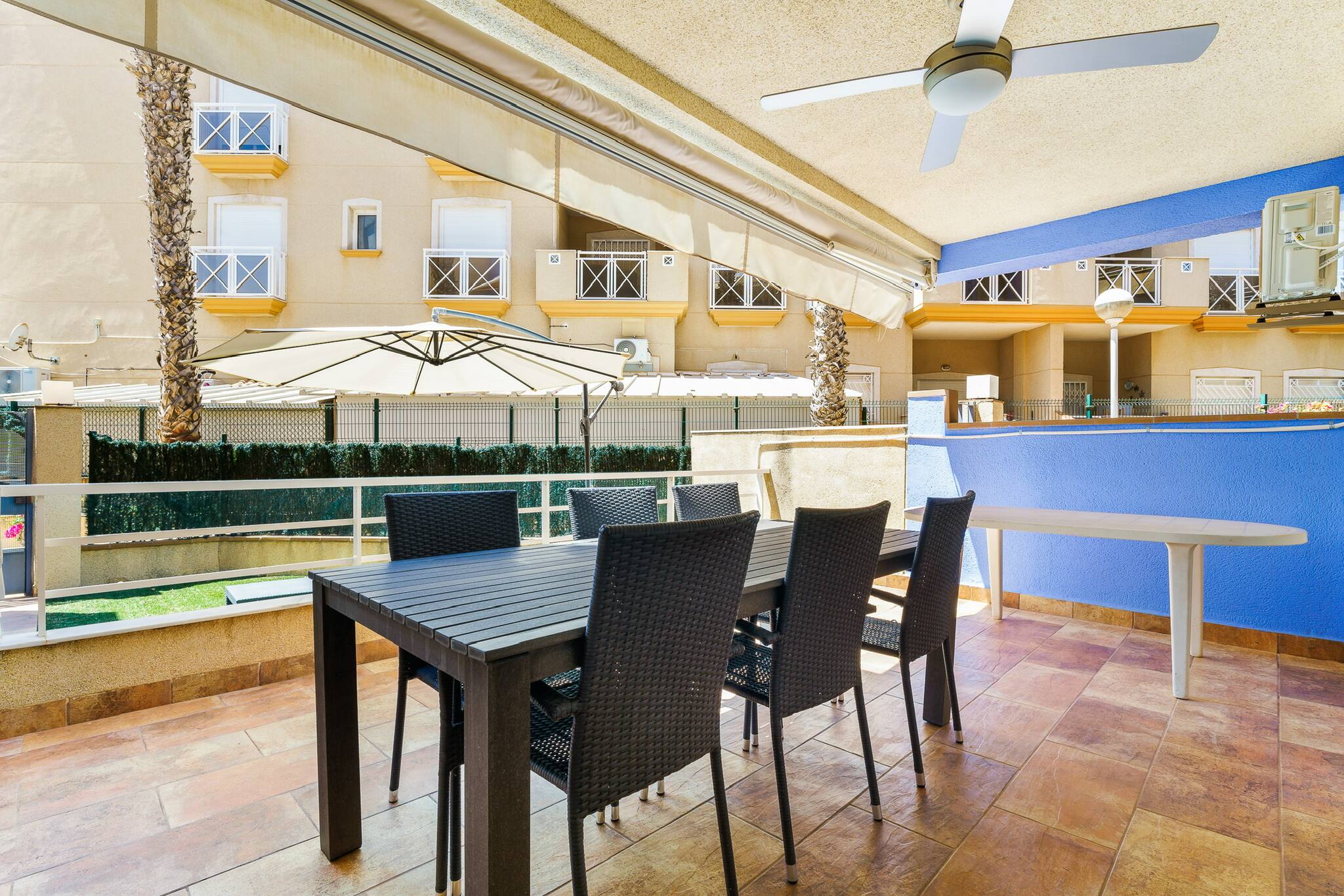 Located in a modern housing development with a swimming pool, green areas and children's play area, it is ideal for families or couples.