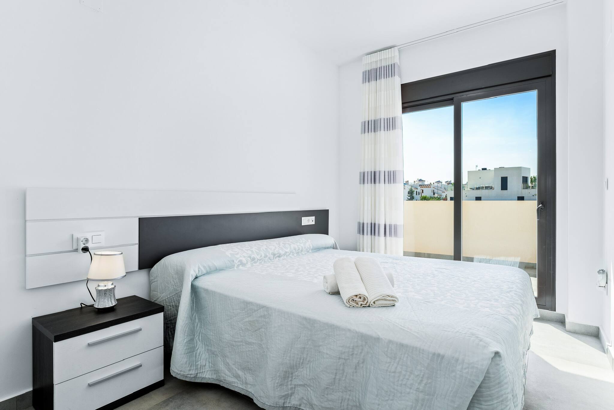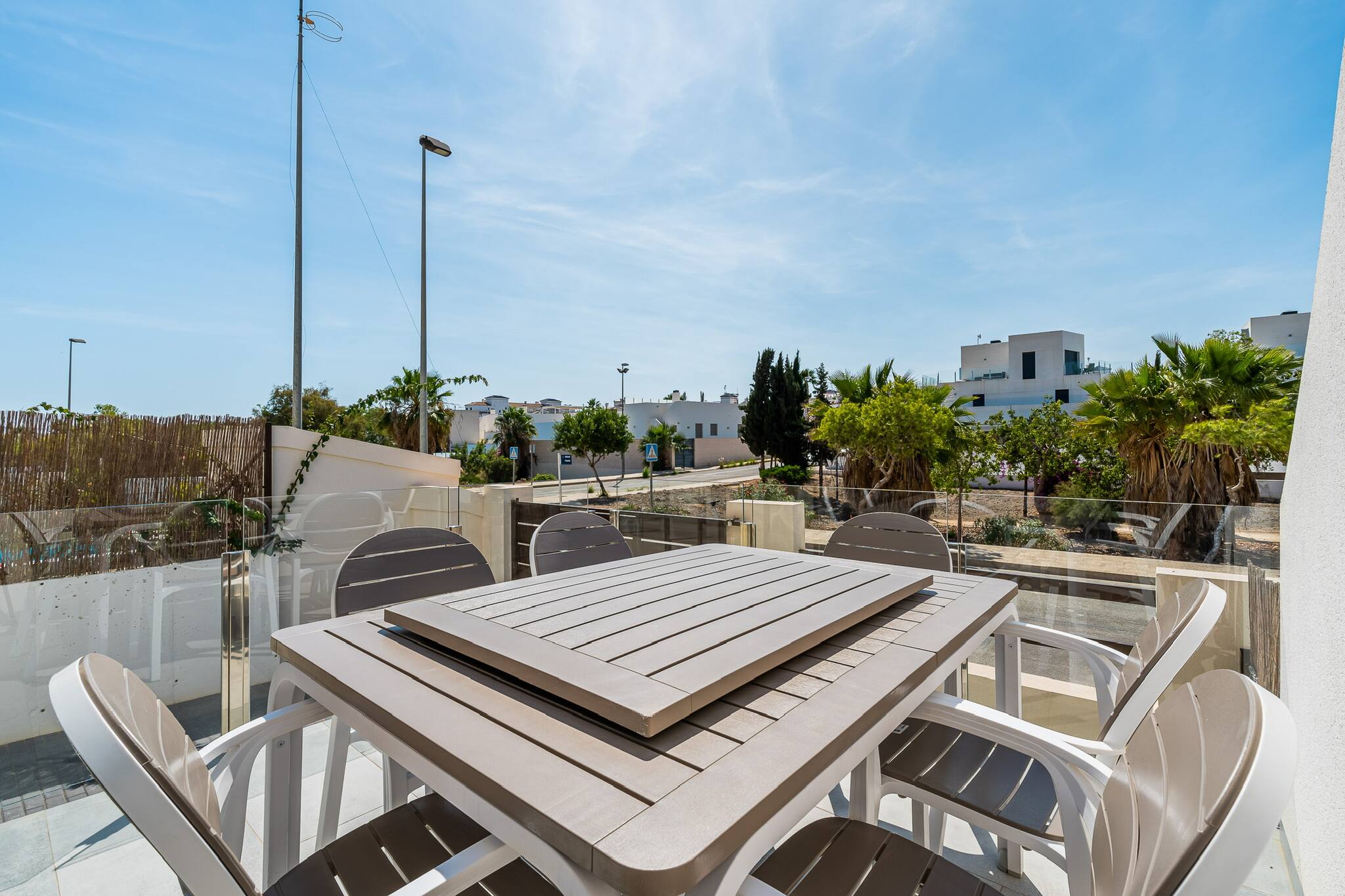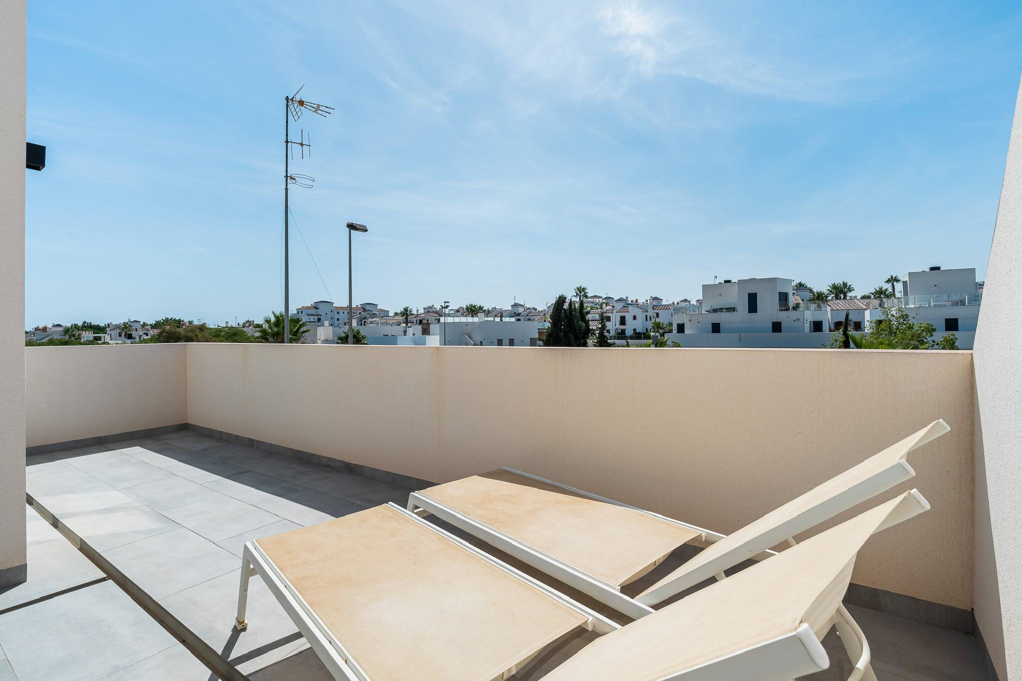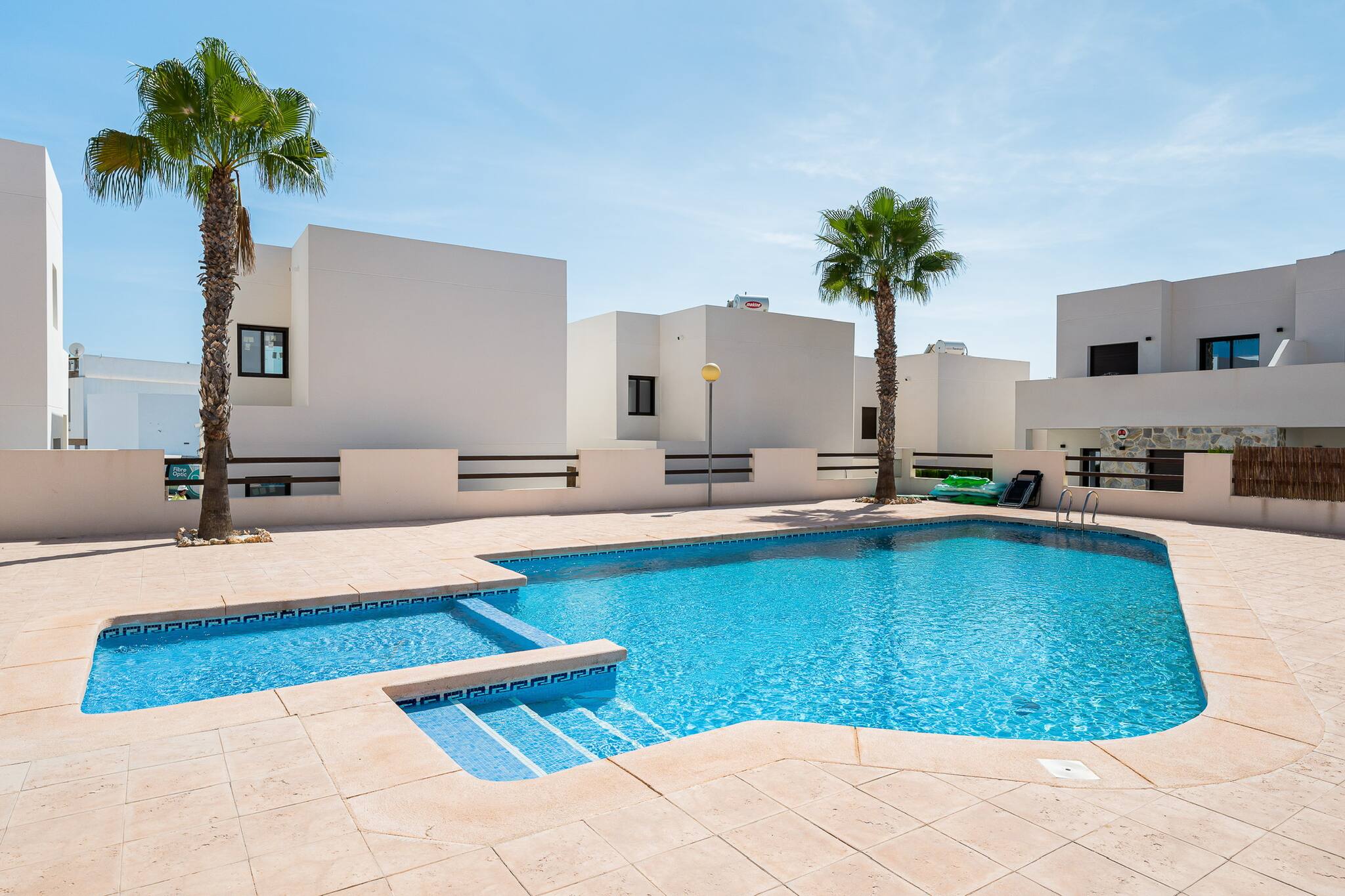 This cosy 3-bedroom house is perfect for a relaxing holiday. It features a spacious terrace and balcony with sun loungers, ideal for enjoying the sun. The outdoor dining area is perfect for dinners on warm summer nights. The house has air conditioning for your comfort and access to a communal swimming pool. Located just minutes from the Villamartín golf course, it is an excellent option for both golfers and those seeking tranquillity and comfort.