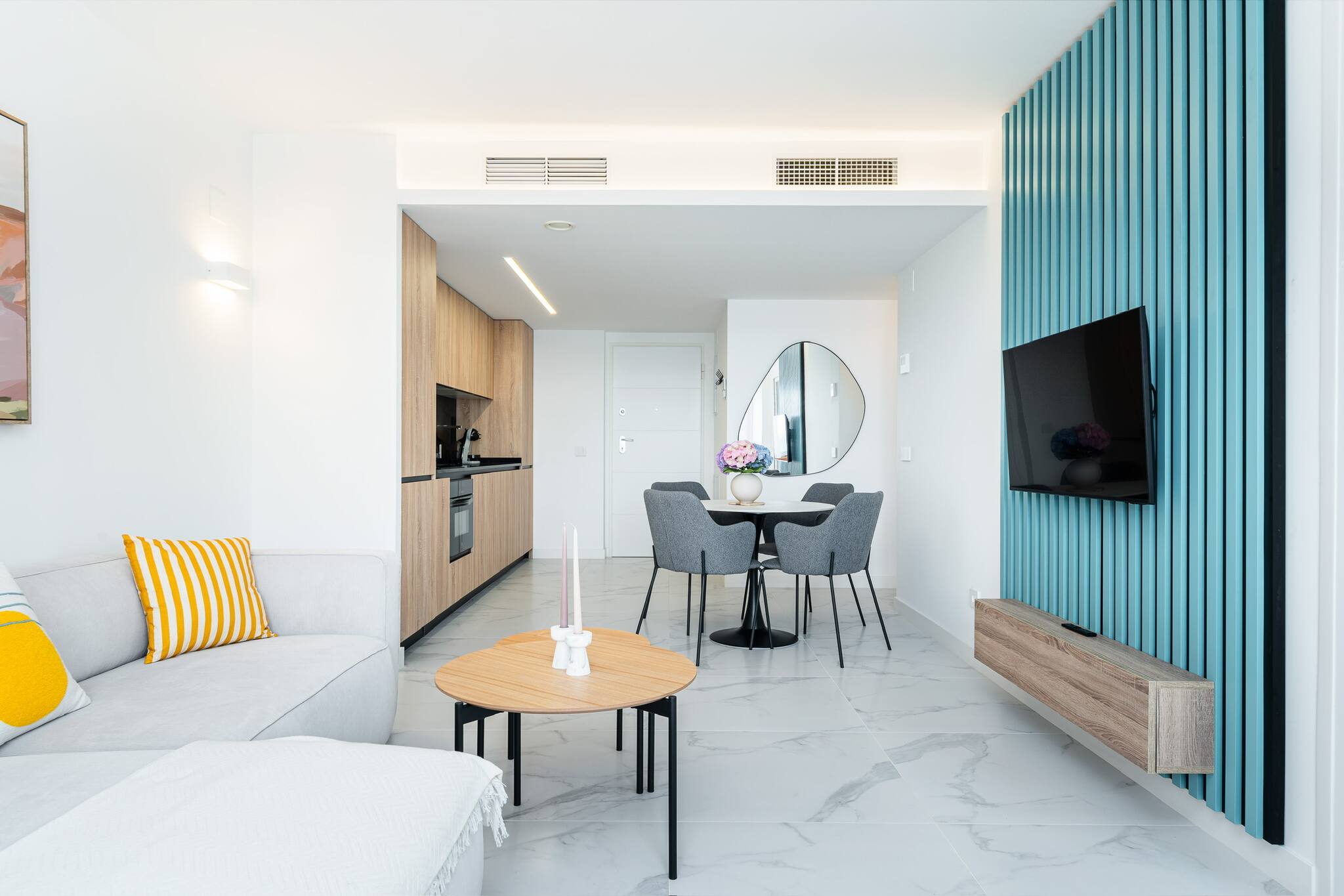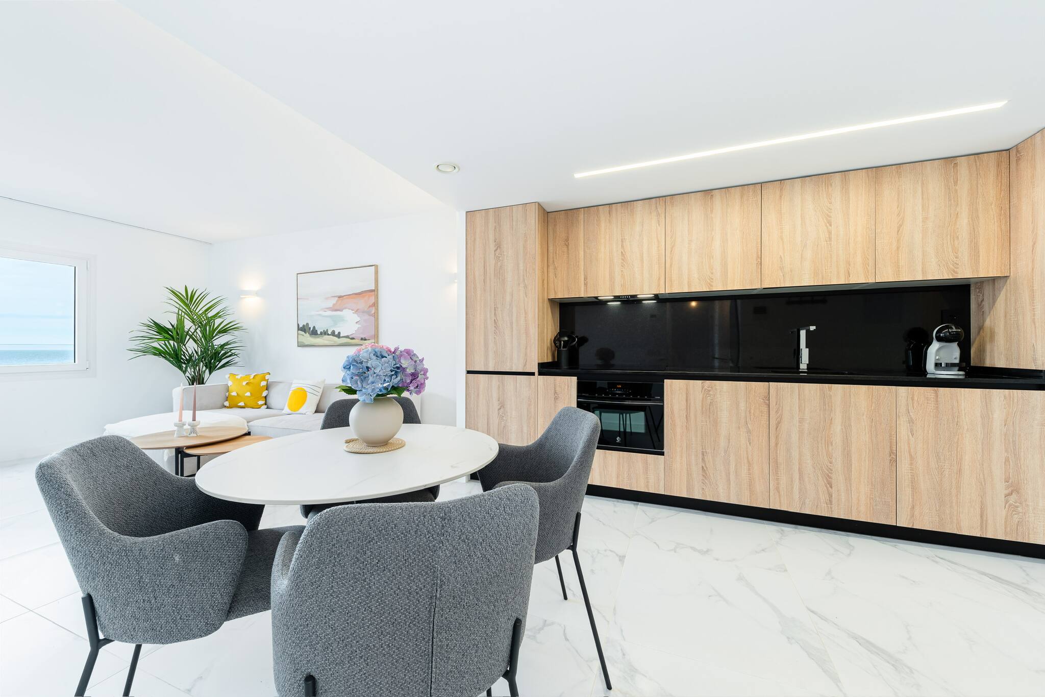 The kitchen is equipped with the main appliances (coffee maker, microwave, oven, fridge and ceramic hob), and the living room has a Smart TV.