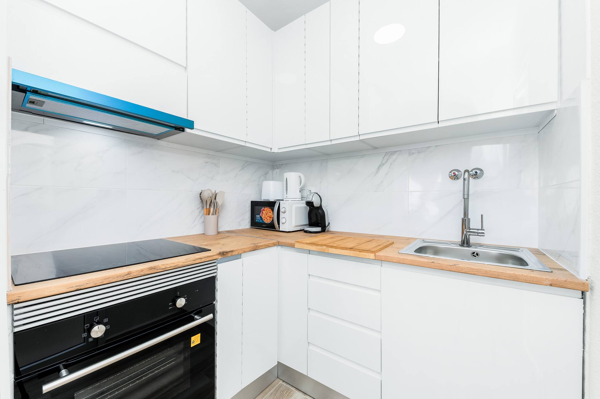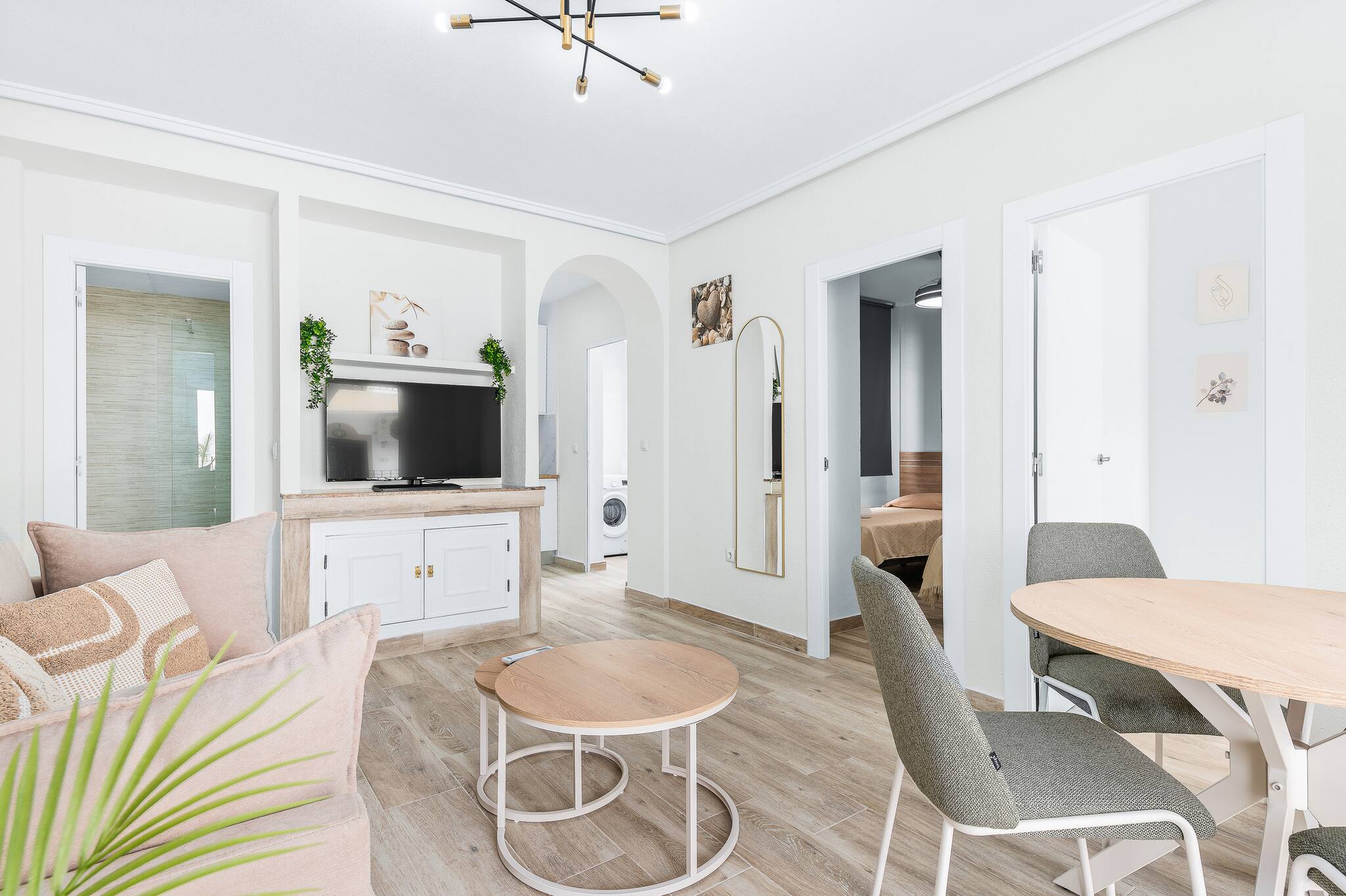 The kitchen is equipped with the main appliances (coffee maker, microwave, oven, fridge and ceramic hob), and the living room has a Smart TV.