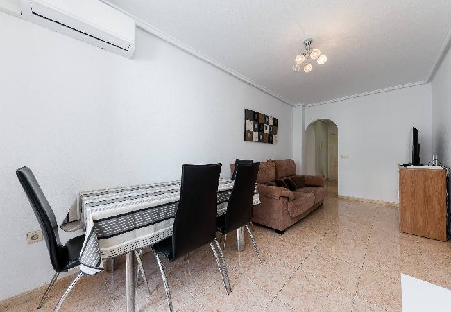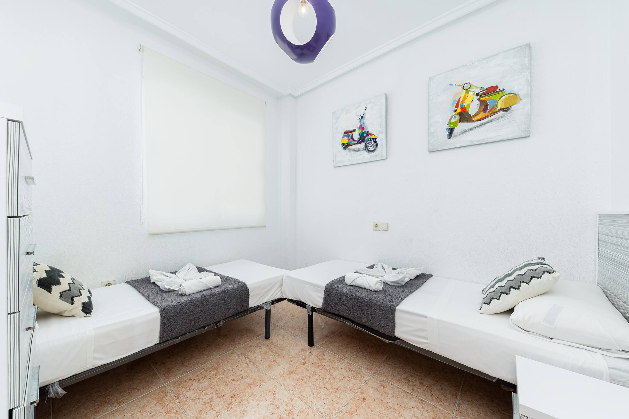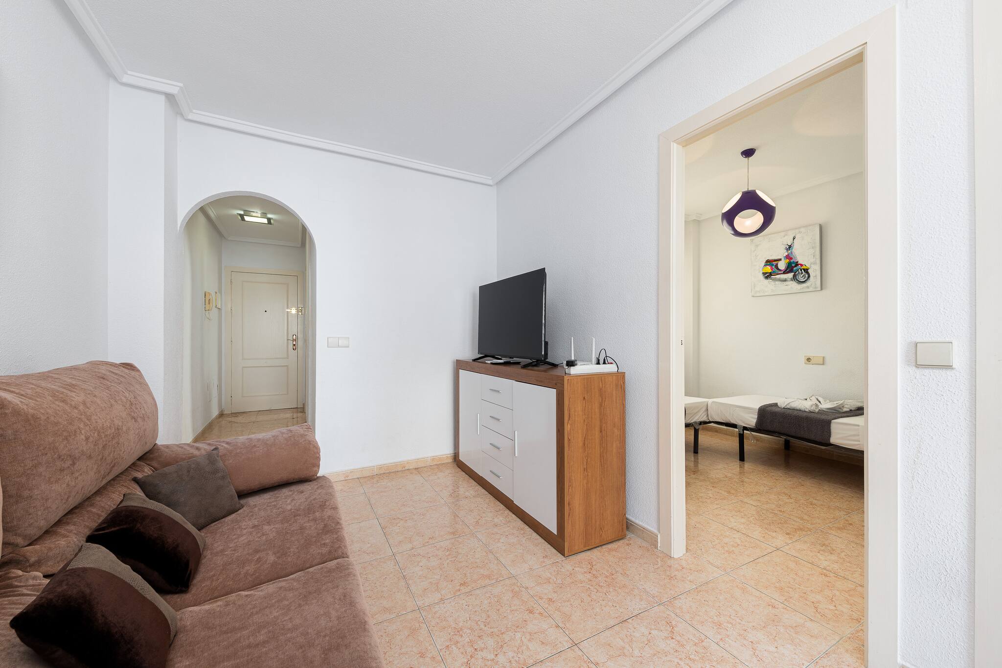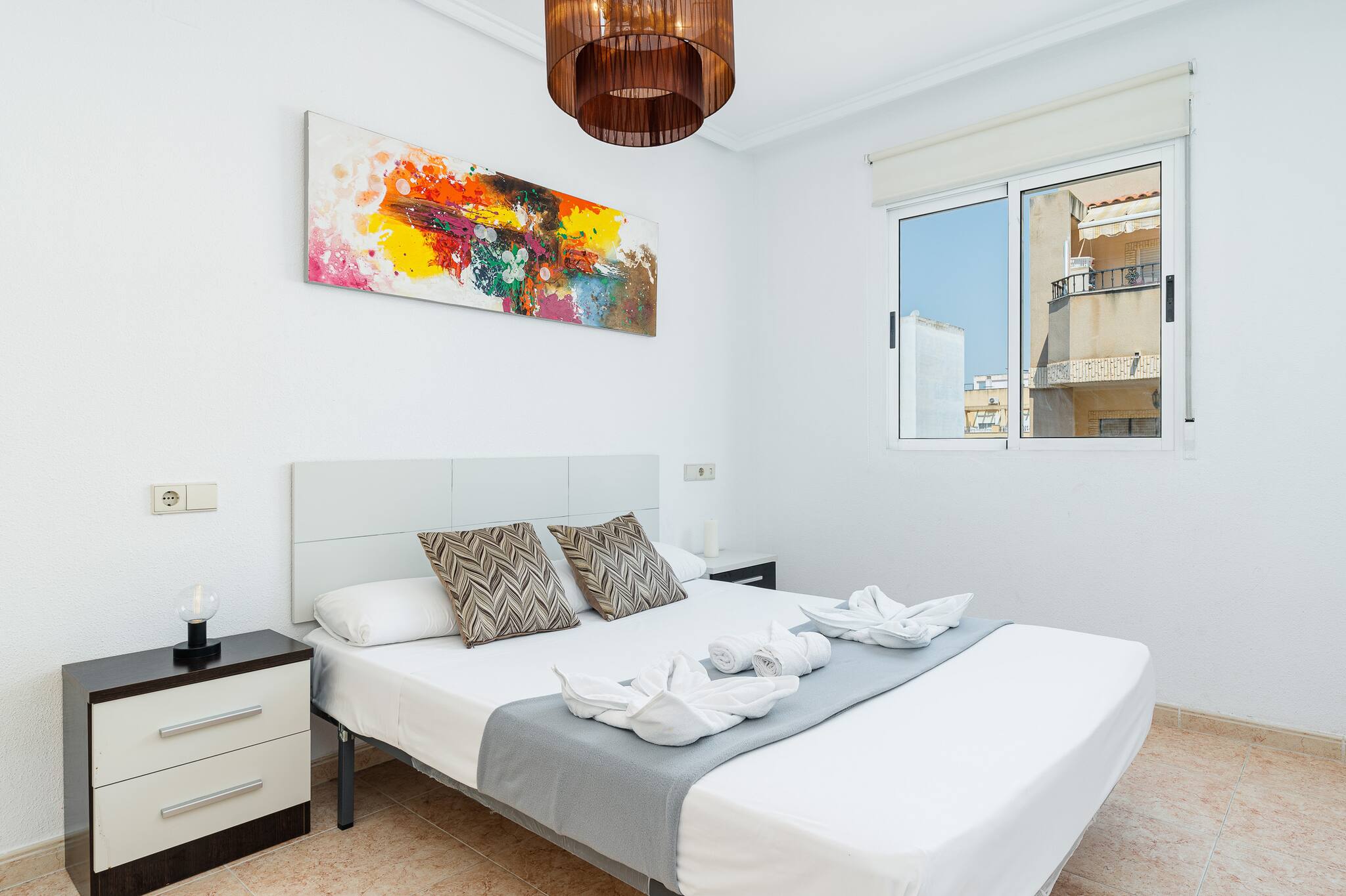 Modern and bright apartment in the heart of Torrevieja, ideal for enjoying a holiday by the sea. It has 2 comfortable bedrooms, living room with sofa and flat-screen TV, fully equipped kitchen and air conditioning. The building offers a communal swimming pool perfect for relaxing under the sun. A few minutes' walk from the beach, restaurants and shops. Perfect for families, couples or friends looking for comfort and an unbeatable location.