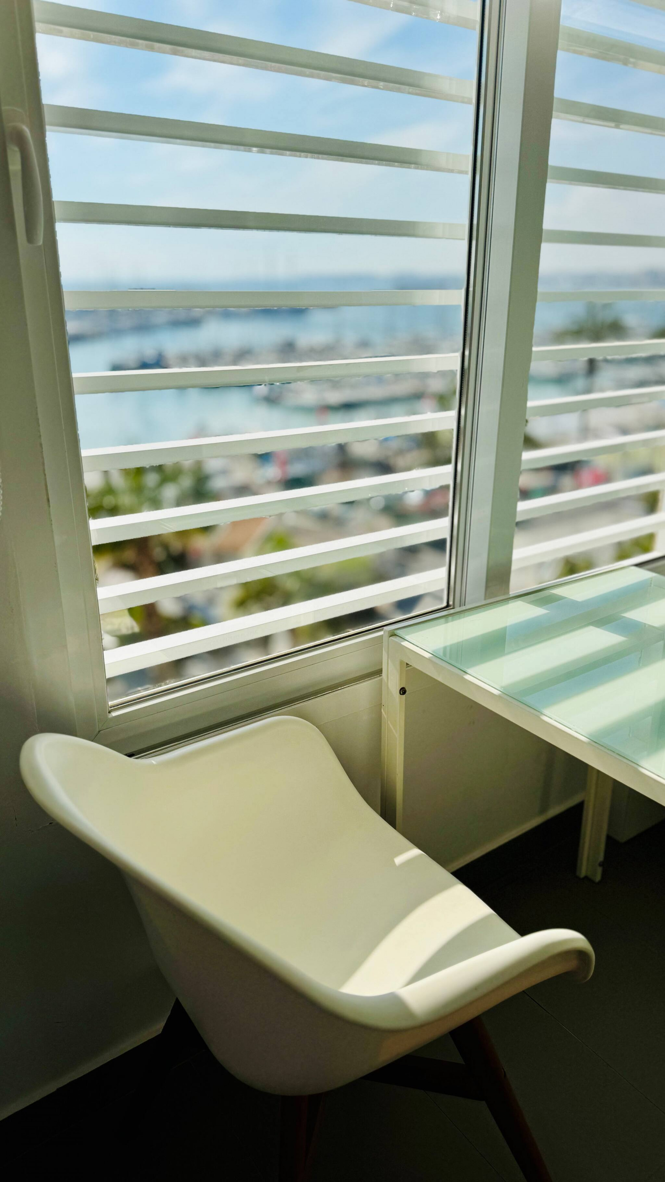 The living room has a large window overlooking the marina, where you can enjoy morning coffee and dinner under the stars at night.