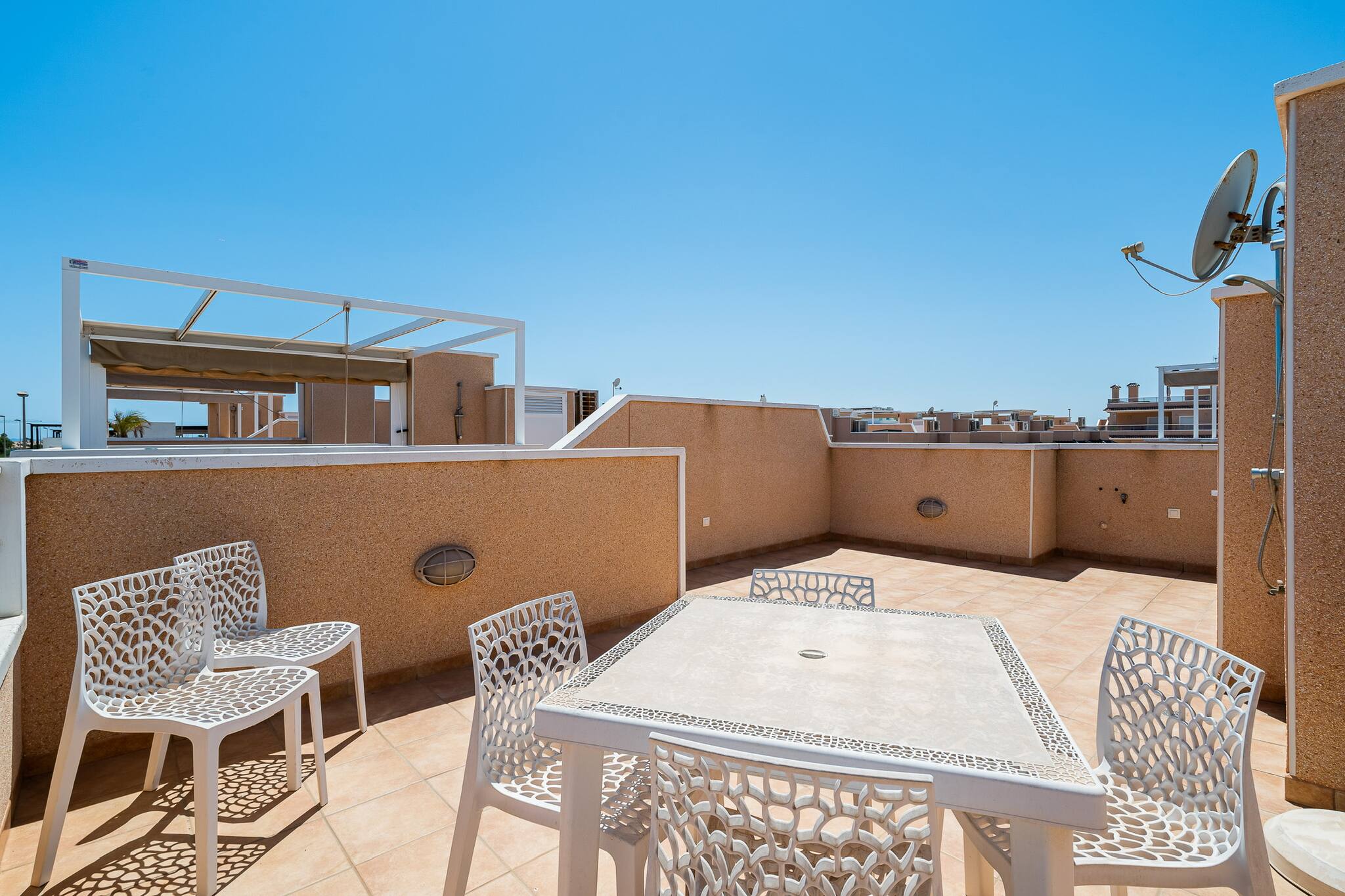 Welcome to our charming 3-bedroom apartment! Enjoy a cool atmosphere with centralised air conditioning. Relax on the spacious terrace, equipped with a dining area and outdoor shower, or enjoy the views from the balcony. Just a few steps away you will find a communal swimming pool and a children's playground, ideal for families. We are very close to the beautiful Higuerica beach, perfect for sunny days and sea. A perfect space to create unforgettable memories!
