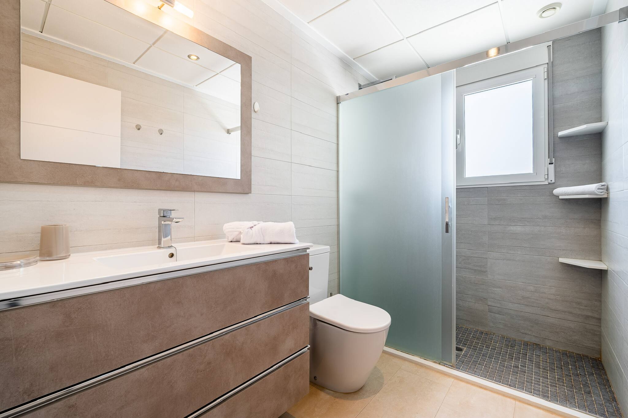 This apartment has 2 bedrooms, kitchen with fridge and dishwasher, flat-screen TV, living area and 1 bathroom with shower. There are towels and bed linen in the apartment.