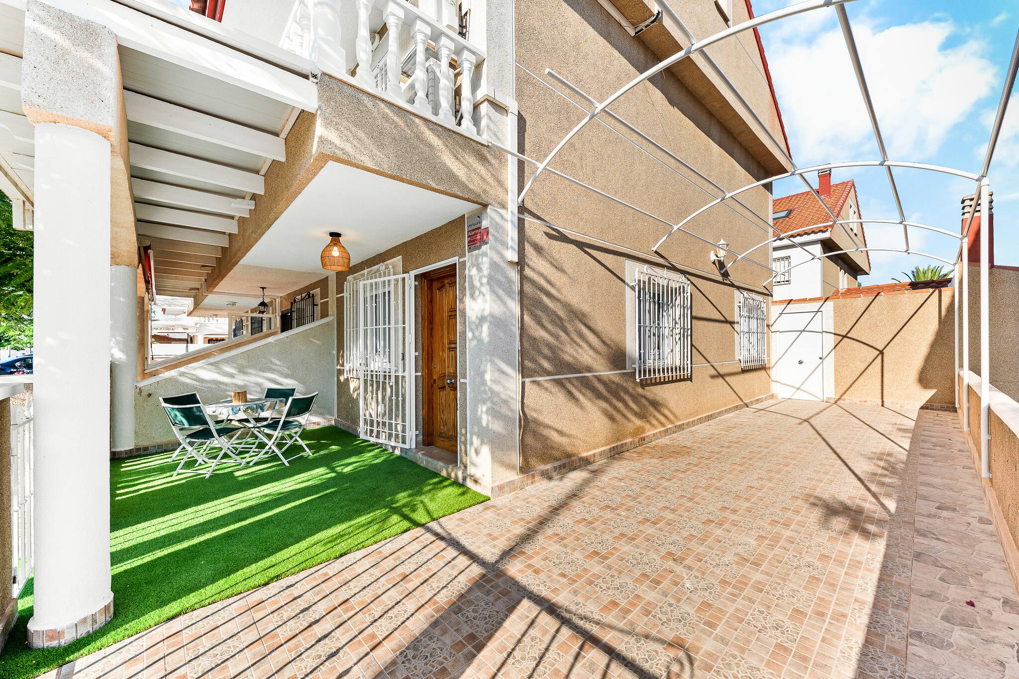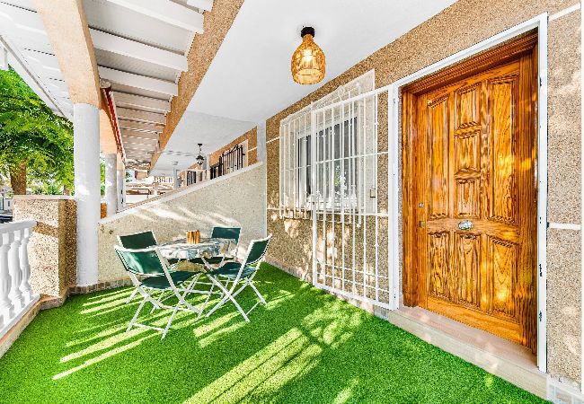 This cosy holiday home on Ancla Street 74, Torre de la Horadada is the ideal place to enjoy the sun and tranquillity of the Mediterranean. Just a few minutes' walk from the beach and seafront promenade, it offers access to crystal-clear water coves, seafront restaurants, supermarkets and everything necessary for a comfortable stay. The property has been tastefully renovated and features a fully equipped modern kitchen, a spacious dining room with direct access to a private patio with a chill-out area, perfect for relaxing outdoors. It also has a shaded front terrace, bright rooms, air conditioning, Wi-Fi, washing machine and two bathrooms, making it ideal for families or groups. Located in a quiet residential area, but well connected with Orihuela Costa, San Pedro del Pinatar and leisure centres such as La Zenia Boulevard, this house is perfect for a relaxing holiday on the Alicante coast.