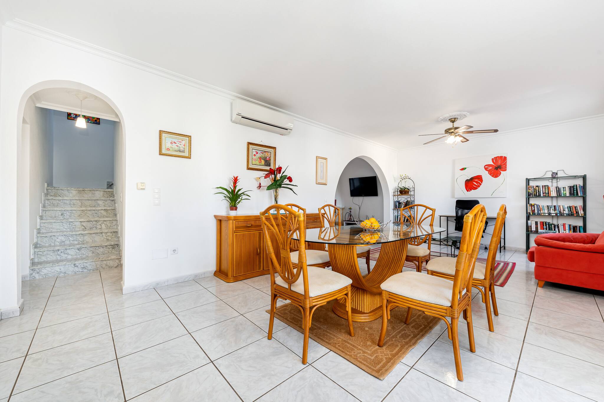 The villa in San Miguel de Salinas has 4 bedrooms and has capacity for 8 people. The villa is cozy, is spacious, and is 200 m². The property is located 3 km from San Miguel de Salinas city, 5 km from Villamartín city, 5 km from Villamartín Golf golf course, 5 km from Mercadona supermarket, 6 km from Lidl supermarket, 6 km from Las Ramblas golf course, 7 km from Campoamor Golf golf course, 7 km from Orihuela Costa city, 8 km from Playa de La Zenia sand beach, 8 km from Playa Flamenca sand beach, 8 km from Cala Mocosa rock beach, 8 km from Cala Cerrada rock beach, 9 km from Playa de Campoamor sand beach. The house is situated in a residential neighborhood in a residential complex. The accommodation is equipped with the following items: garden, garden furniture, fenced garden, washing machine, barbecue, iron, internet (Wi-Fi), hair dryer, heat pump, air-conditioned, private swimming pool, open-air parking, 1 TV, satellite tv (Languages: English). In the induction independent kitchen, refrigerator, microwave, oven, freezer, dishwasher, dishes/cutlery, kitchen utensils, coffee machine, toaster, kettle and hob are provided.