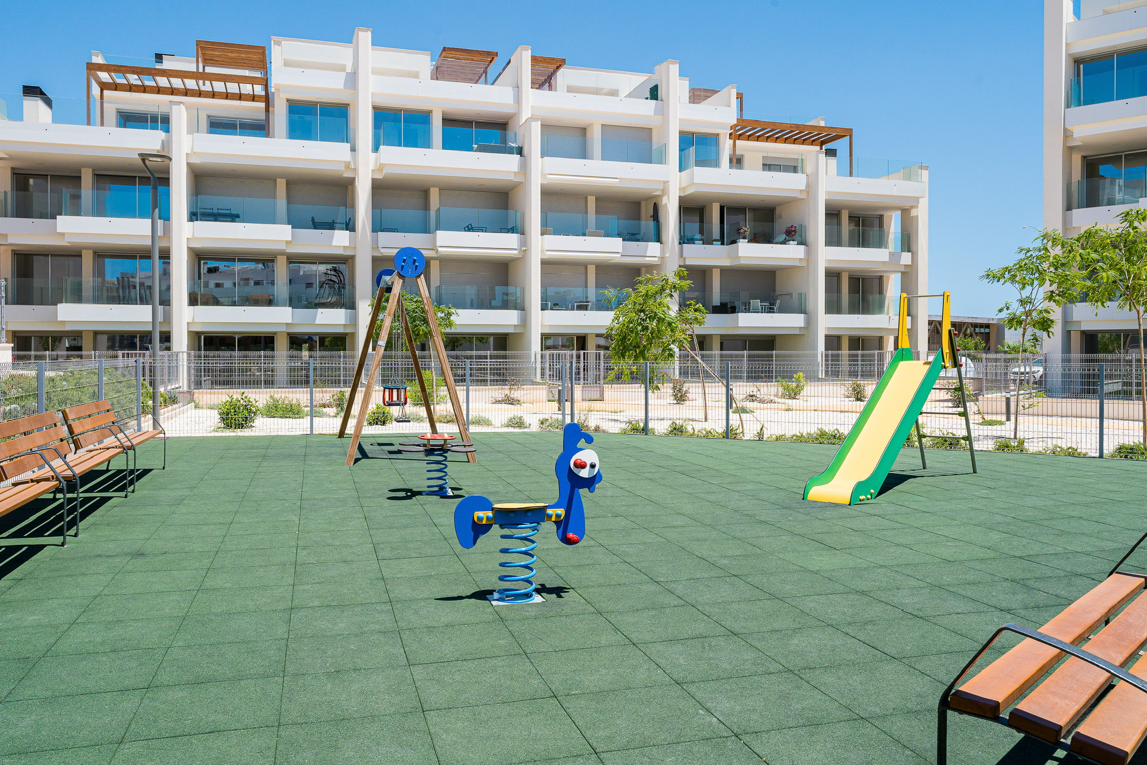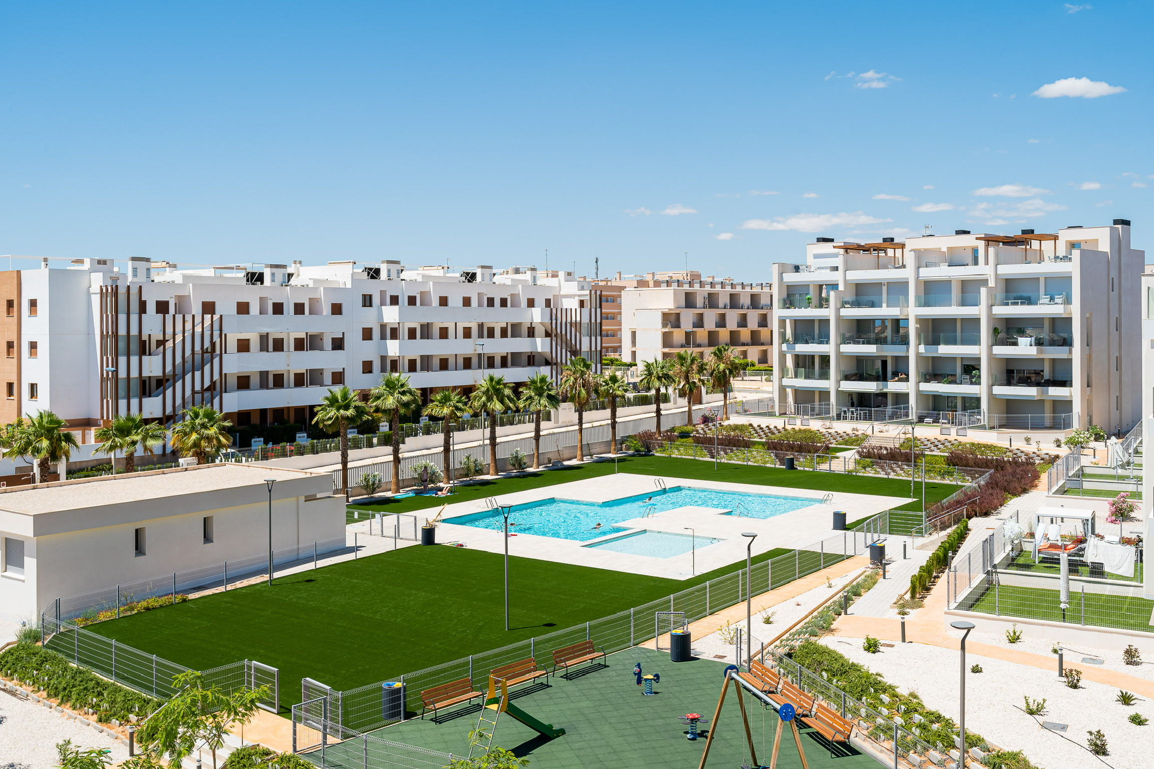 Piscine communautaire, jeux pour enfants et machines pour exercices physiques dans les zones communes.
