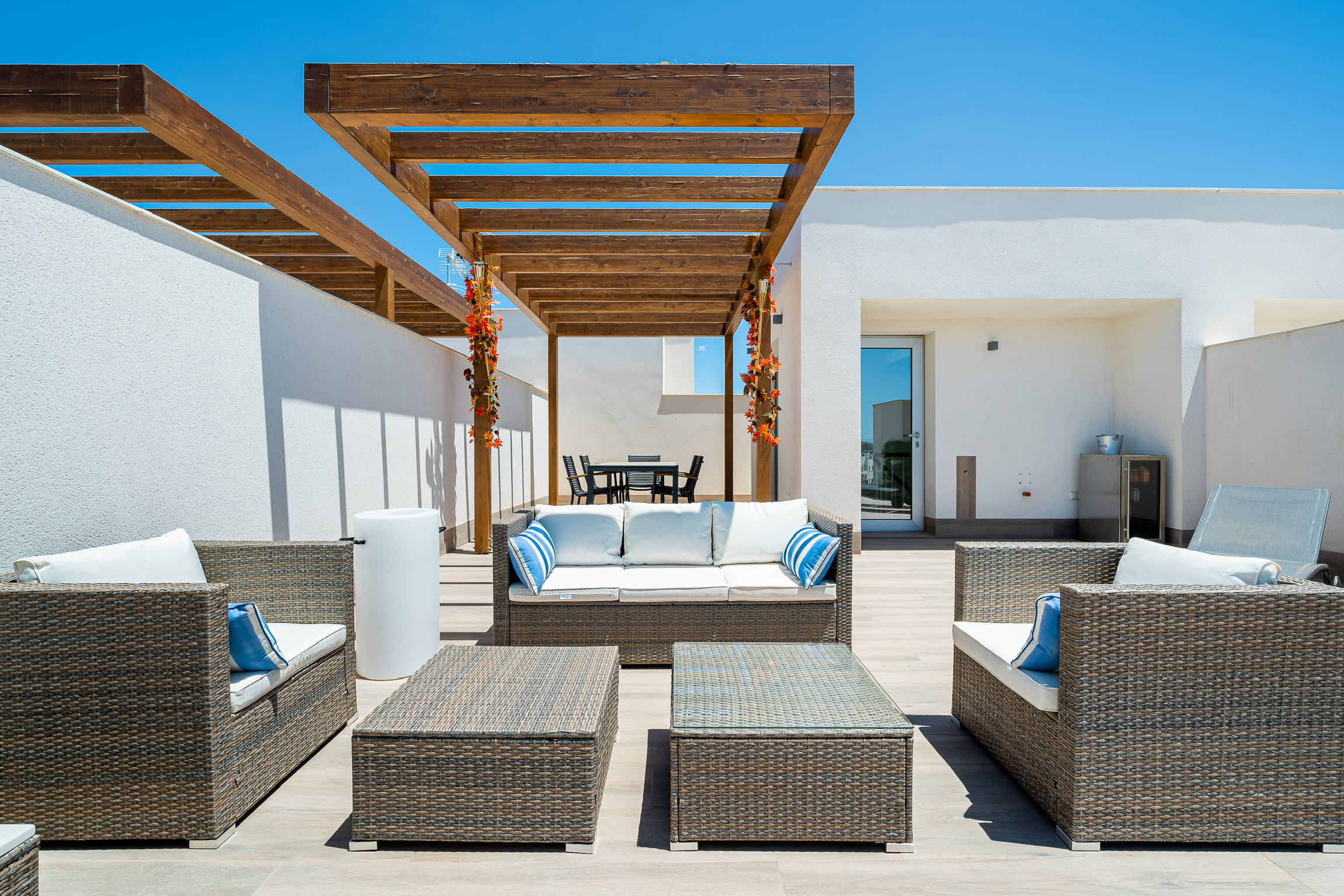Dispose d'un bureau pour le télétravail. Le solarium de 65 m2 est parfait pour profiter du climat et de magnifiques bains de soleil ; avec une douche extérieure, un minibar et une pergola en bois avec une bâche.