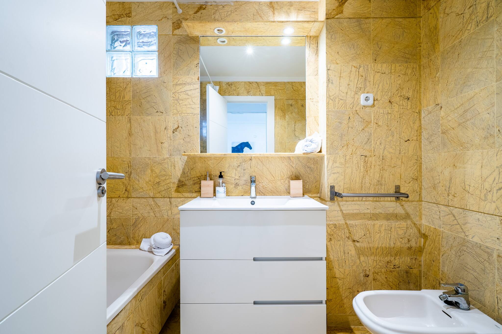 Son grand salon, avec canapé et Smart TV, dispose d'une large fenêtre donnant sur la terrasse et le solarium avec sa zone chill-out, où vous apprécierez les cafés du matin et les dîners sous les étoiles le soir.