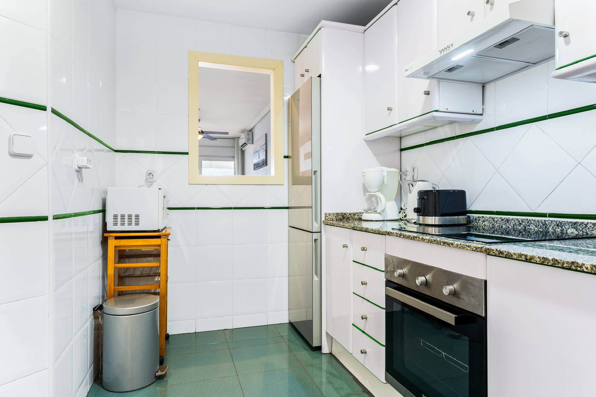 Sa cuisine indépendante est équipée des principaux électroménagers (cafetière, micro-ondes, four, réfrigérateur, grille-pain et plaque vitrocéramique).