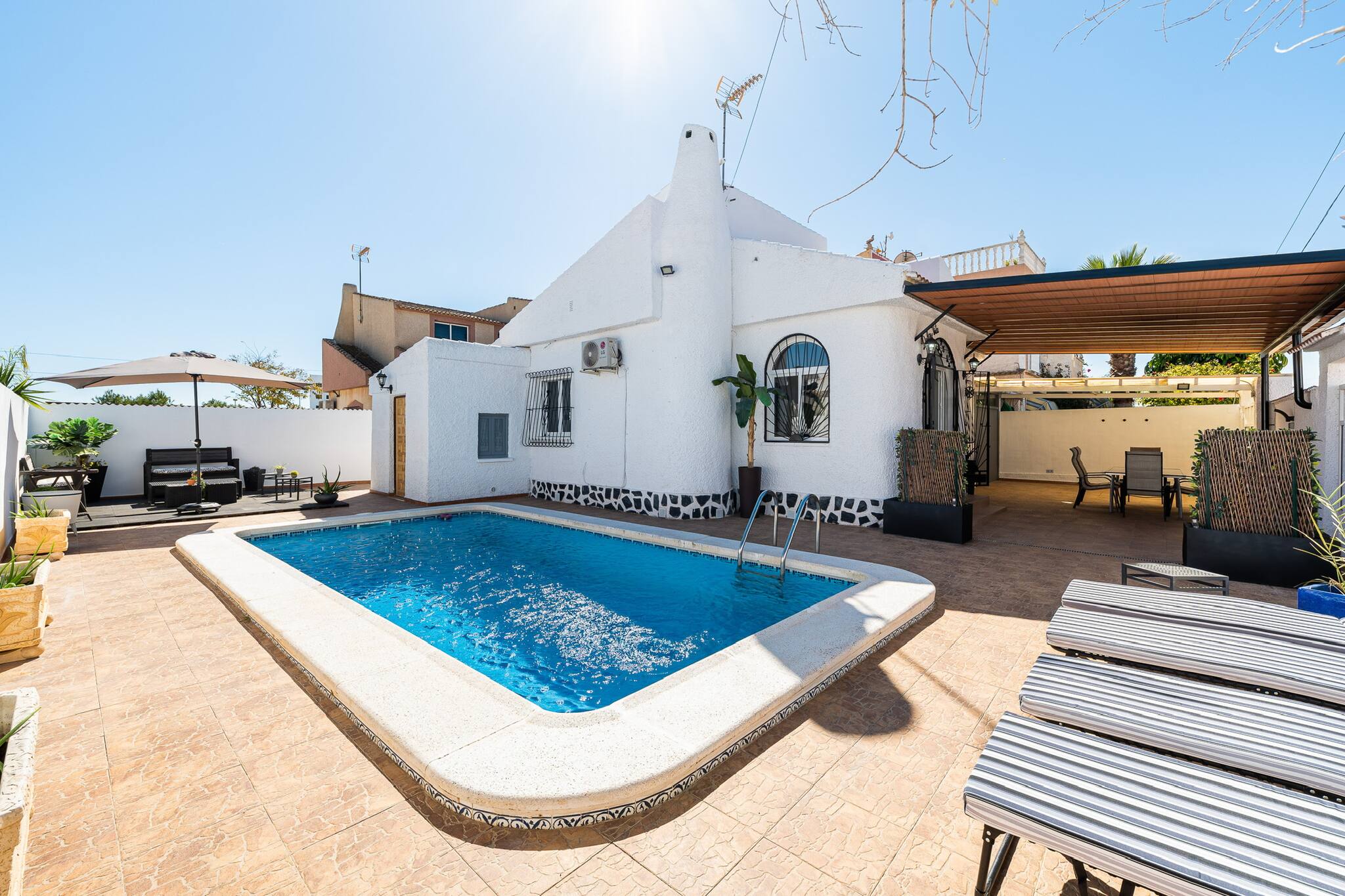Déconnectez-vous dans ce refuge unique à Dehesa de Campoamor, à seulement 10 minutes à pied de la plage de Mil Palmeras. Il dispose de 2 chambres (1 lit double et 2 lits individuels). Profitez d'une piscine privée et d'une terrasse avec des transats pour vous détendre. Son intérieur moderne et accueillant comprend un grand salon avec un canapé-lit, la climatisation et deux chambres confortables. Idéal pour les familles ou les amis, ce logement combine détente et confort dans un emplacement privilégié près des attractions touristiques.